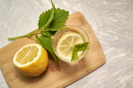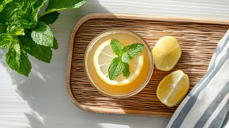 A Refreshing herbal tea with mint and lemon slices on wooden tray