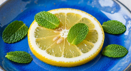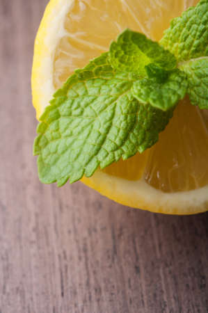 Lemon sliced and fresh mint on an abstract wooden surface