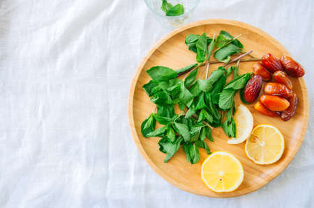Ingredients for moroccan tea. Mint leaves dates on a wooden plate. White background.