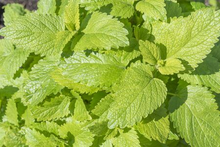 Green lemon balm leaves in the garden.