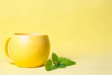 Yellow cup of hot tea with mint on yellow background.