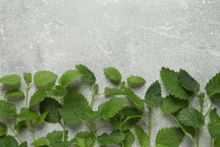 Fresh green lemon balm leaves on light gray table, flat lay. Space for text