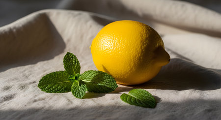 A fresh whole yellow lemon sits next to sprigs of green mint leaves on a textured beige linen cloth. Natural sunlight casts soft shadows highlighting the vibrant citrus fruit and organic herbs.