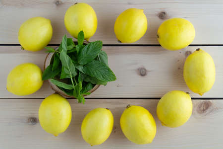 mint, lemons on wooden background