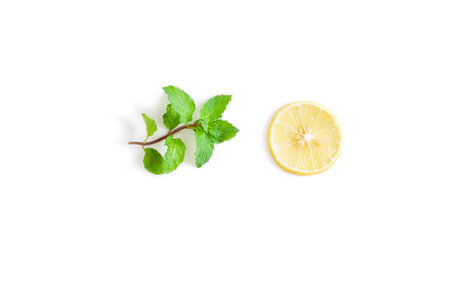 Top view of lemon slices and mint herbs on white background. Minimal refreshment concept design.