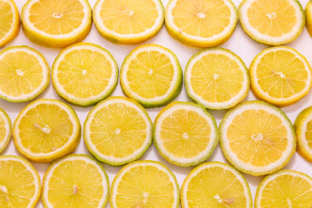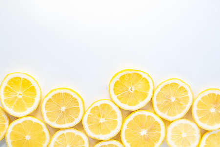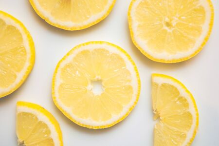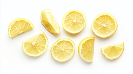 Fresh lemon slices arranged artistically on a white background