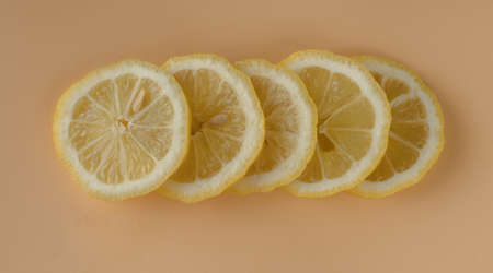 Pieces of lemon, Lemon sliced into slices on a background of apricot color in isolation