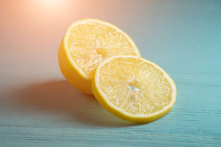 Ripe juicy yellow lemons slices on beautiful wood background. Prevention of colds in the cold season, ingredient for lemon tea or homemade lemonade.