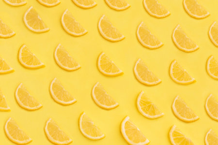 Ripe fresh sliced lemon wedges background, flat lay