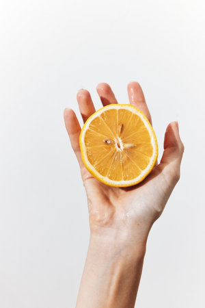 Hand holding half of an orange on white background with copy space