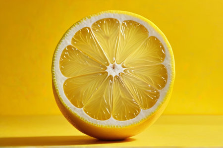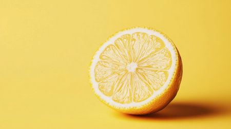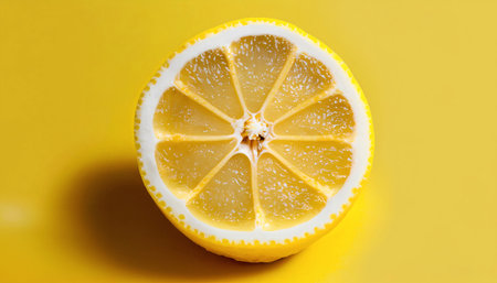 A vibrant, fresh lemon slice rests on a bright yellow background, showcasing its juicy texture and unique pattern, perfect for food-related themes.