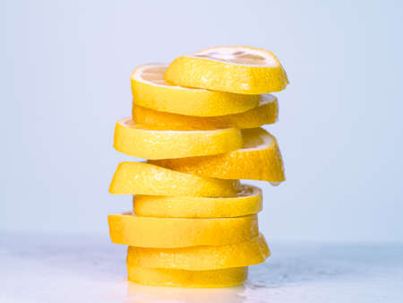 Juicy lemon slices piled together on light table, close up view.