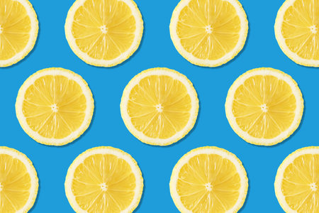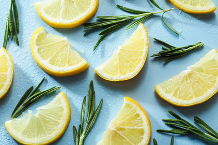 Lemon slices arranged on a soft blue pastel background, bursting with citrus energy.