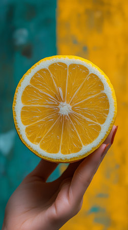 A vibrant lemon is held in one hand, showing its juicy, bright yellow interior against a colorful backdrop of yellow and teal colors. The freshness of the fruit stands out.