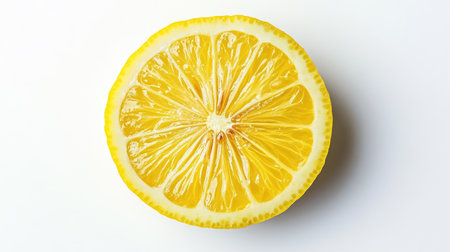Top view of a vibrant lemon slice isolated on white, capturing the radial pattern of the citrus fruit