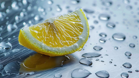 A close-up image of a fresh lemon slice resting on a reflective surface, adorned with glistening water droplets, highlighting vibrant color and texture.