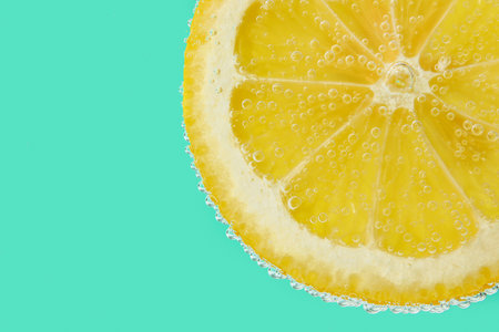 Lemon slice in water with bubbles on turquoise background
