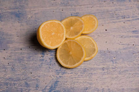Sliced Lemon wedges in a row on the Blue grunge surface. Source of vitamin C during cold and flu season. Copy space image.