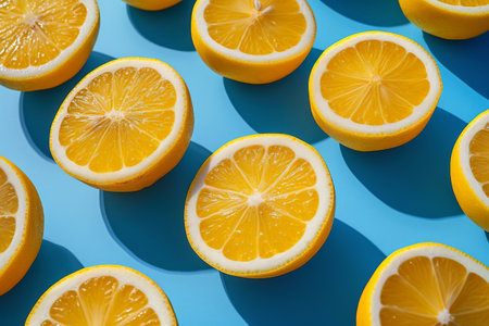 Sliced lemons arranged on blue surface with sun in background, fresh citrus fruit concept