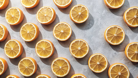 A pattern of sliced lemons on a grey background, illuminated by sunlight.