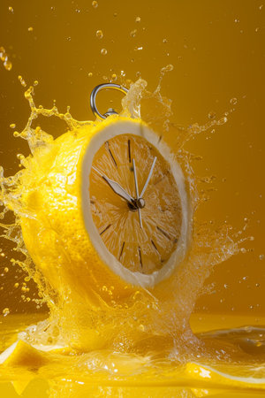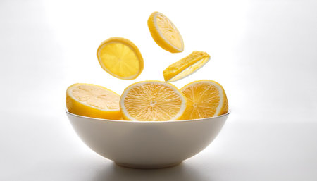 A vibrant close-up of sunlit lemon slices in a ceramic bowl, captured mid-splash as water droplets cascade around them The golden morning light streams through a window, illuminating the citrus with a refreshing glow This image evokes a sense of invigorating freshness and natural beauty AI Generative