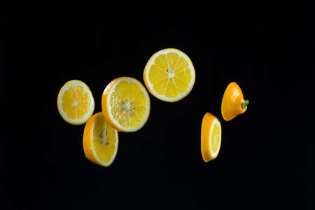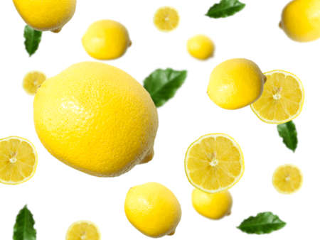 Levitation of a whole lemon and slices with green leaves on a light background.