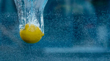Fresh lemon falls into water making big splash of drops and spray on a dark background. Juicy and fresh concept of lemon in water.