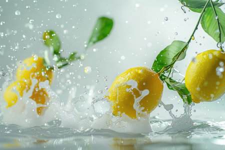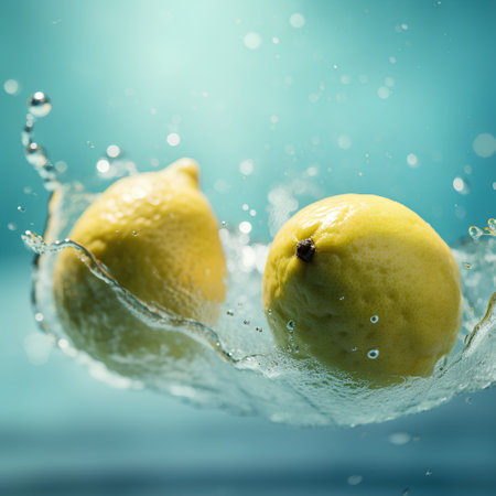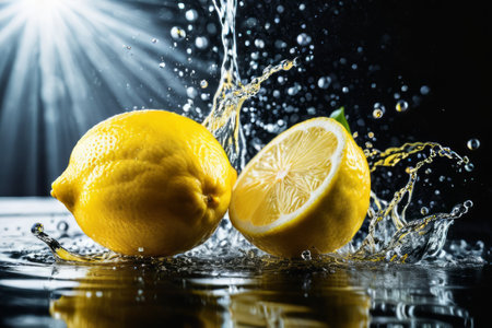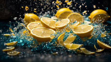 Whole and sliced lemons plunging into water, creating a lively splash with droplets frozen mid-air, symbolizing zest and refreshment.