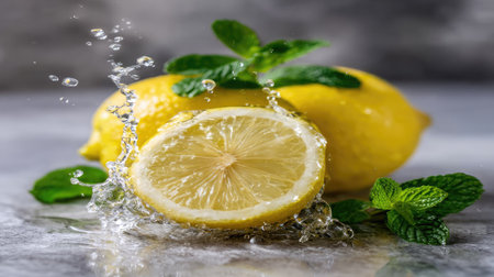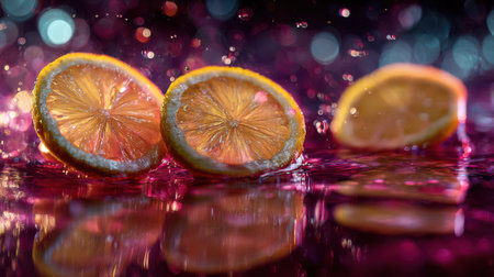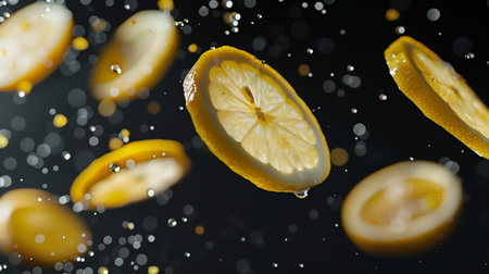 Bright and fresh lemon slices with a water splash captured beautifully on a reflective surface, perfect for culinary use, healthy living, or beverage concepts.