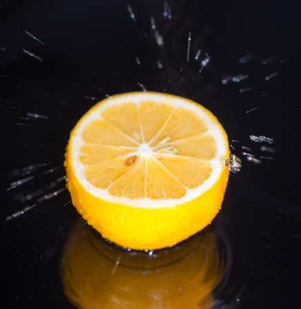Fresh lemon falling into water with splash on black background. Creative concept.