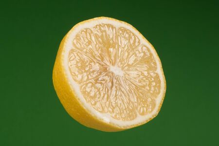 Lemon halves suspended in air, vibrant green backdrop, citrus essence