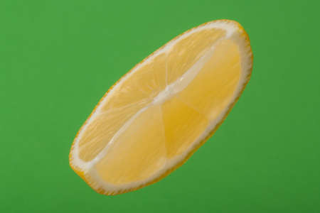 A minimalist image of a lemon slice on a smooth yellow background, highlighting its vibrant color.