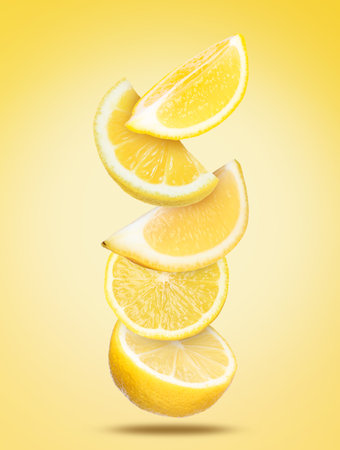 Bright yellow lemons float against a vibrant yellow background. The composition highlights the freshness and zest of the fruit, showing whole and halved lemons in a playful arrangement.