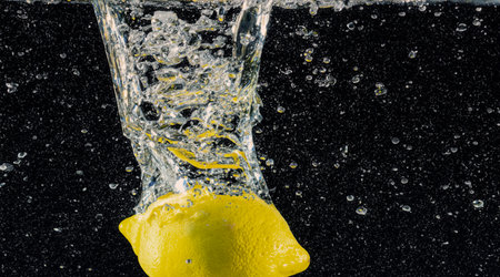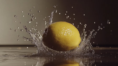 A bright yellow lemon creates a stunning splash in water, showcasing dynamic droplets and vibrant colors against a dark background, perfect for food and beverage themes.