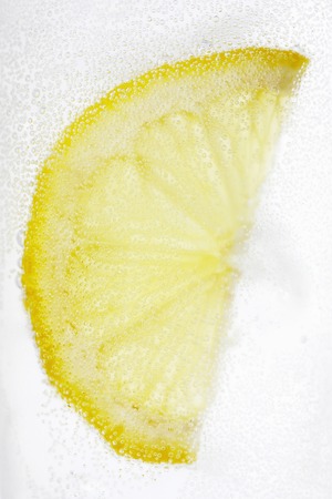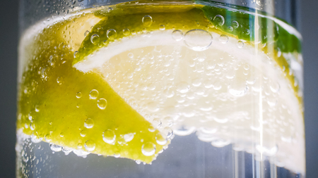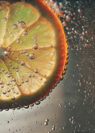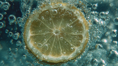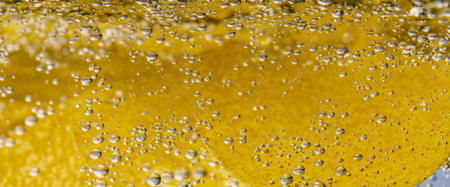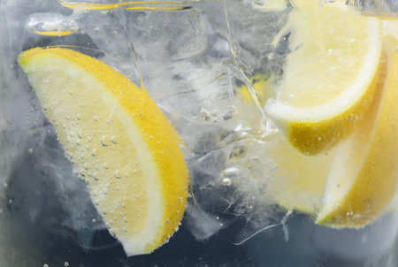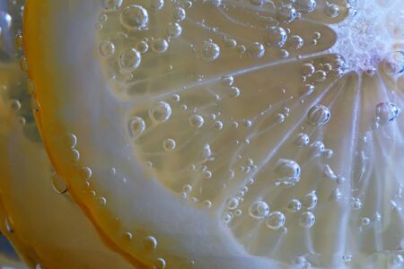 Macro photo of air bbubles on lemon slices in glass of cold water