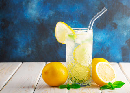 A glass of cold, refreshing lemonade. Mojito cocktail with lemon and mint. Cold drink on a wooden background.
