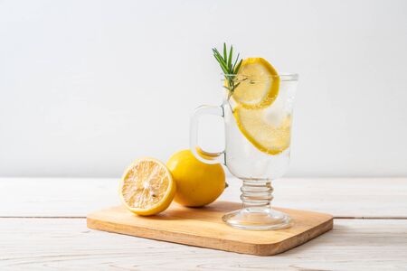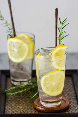Lemonade with fresh lemon and rosemary in glass on wooden background