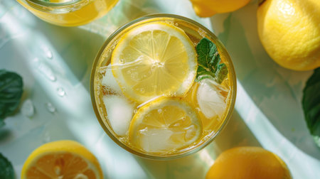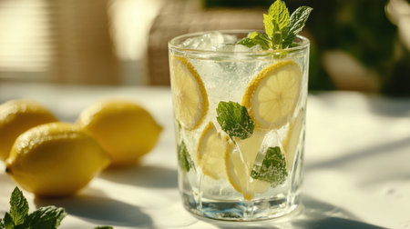 A refreshing lemonade drink features lemon slices and mint leaves, served with ice in a clear glass. Perfect for hot summer days, this vibrant beverage offers a delightful taste of citrus and refreshment.