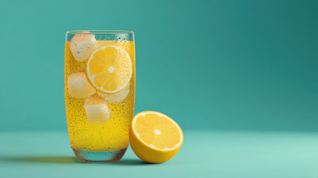 Refreshing drink in clear glass with lemon slices set against colorful summery background of turquoise, white and yellow