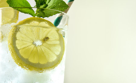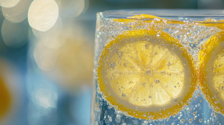 A glass of sparkling water with lemon slices, providing ample room for text.