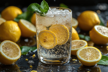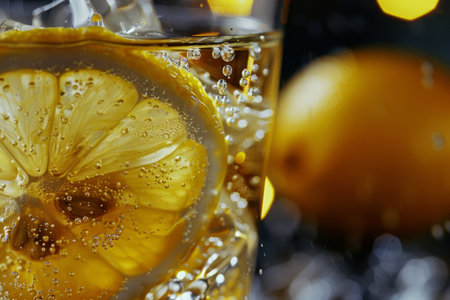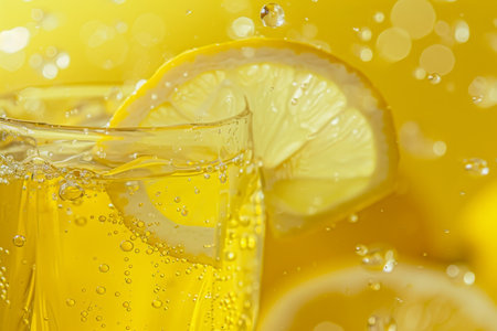 Vibrant lemon drops in yellow drink, high quality image of lemon slice for perfect refreshment