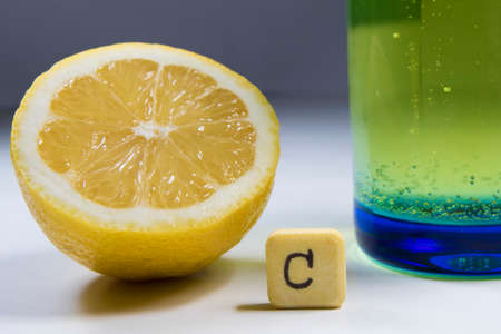 healthcare concepts. glass with water, effervescent vitamin c for health care and yellow lemon on wooden plate on table. recovery pill or after hangover tablet