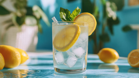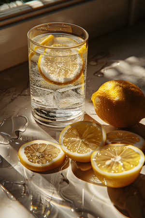 A glass of water with lemon slices and whole lemons nearby, cool blue tones, sharp focus, high resolution