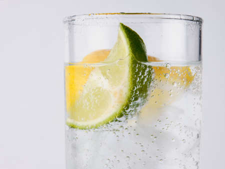 Glass with cold sparkling mineral water, lime and lemon, seltzer