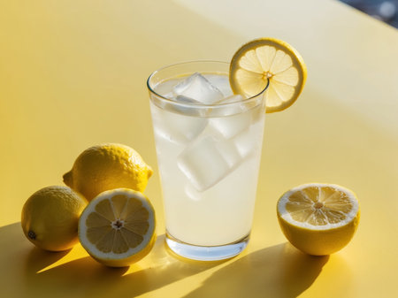 AI Generated. Refreshing lemonade in a clear glass alongside fresh lemons on a bright yellow background during daylight hours