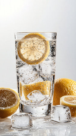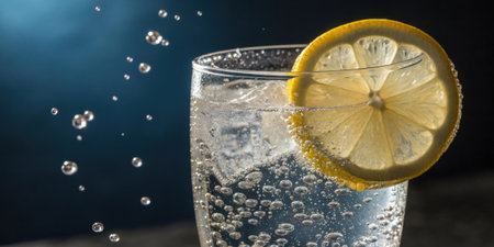 A vibrant glass filled with ice and sparkling water features a splash and a fresh lemon slice. Perfect for summer refreshment or beverage promotion.