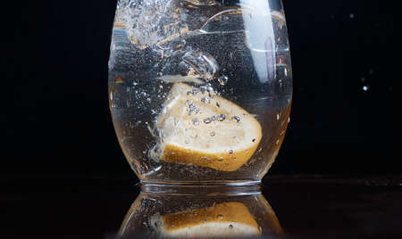 Lemon citrus drops in clear water in a glass splashes blurry background