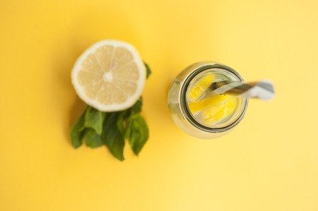 Top view of mason jar glass of lemonade or mojito with lemons and mint on bright yellow background. Summer fresh cocktail.