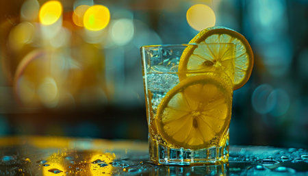 Vivid lemon drops in glass of refreshing yellow beverage, slice of lemon in a vibrant drink
