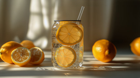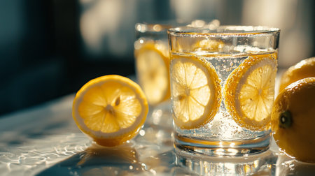 Bright lemon slices float in chilled sparkling water, creating a refreshing drink on a sunlit table. Juicy lemons sit nearby, enhancing the vibrant, summery atmosphere.